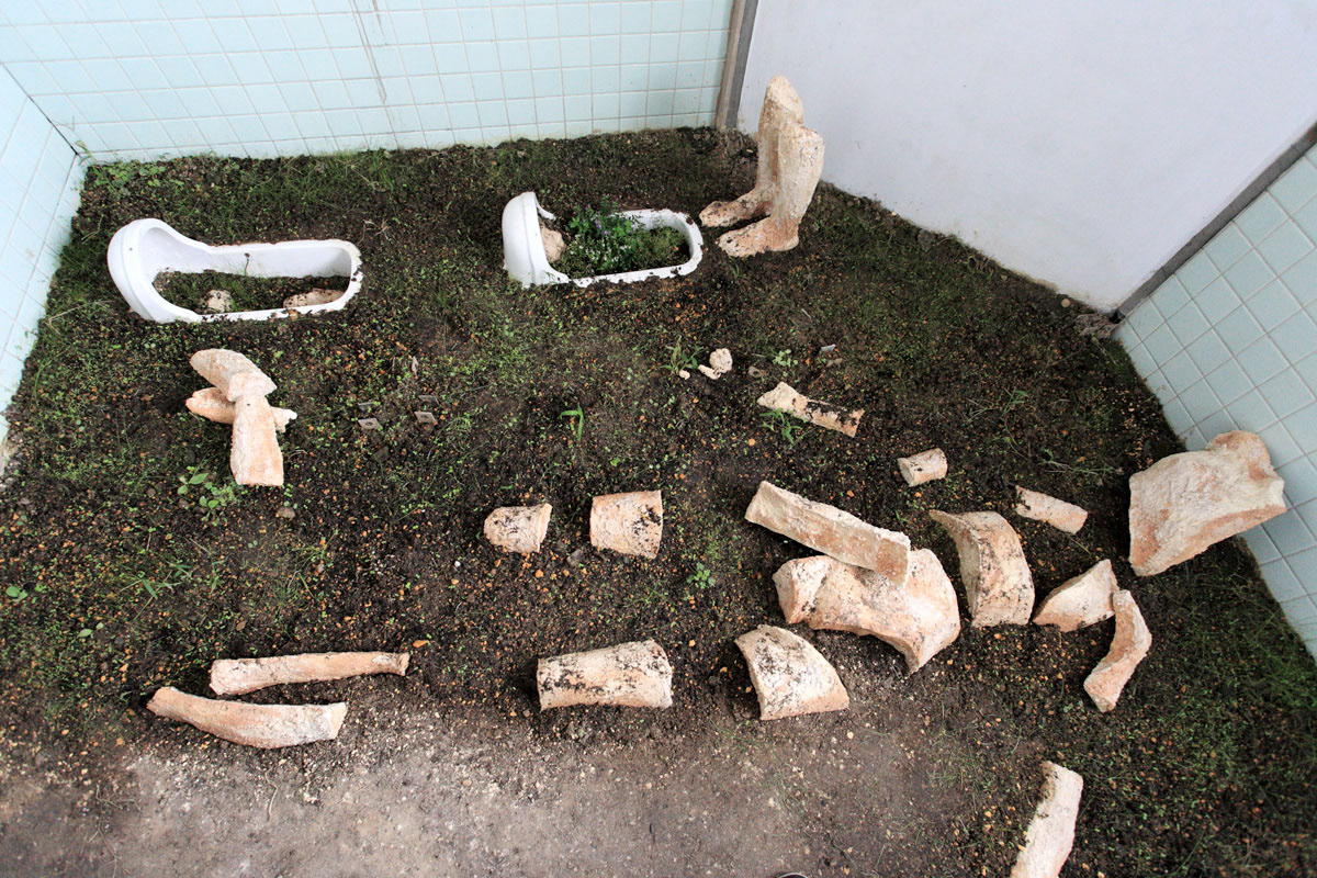 そういったトイレの空間に土を敷き、生と自信を巡る循環の世界を描きたい。